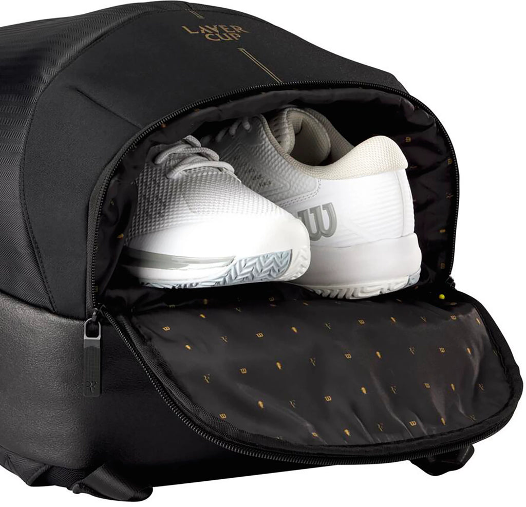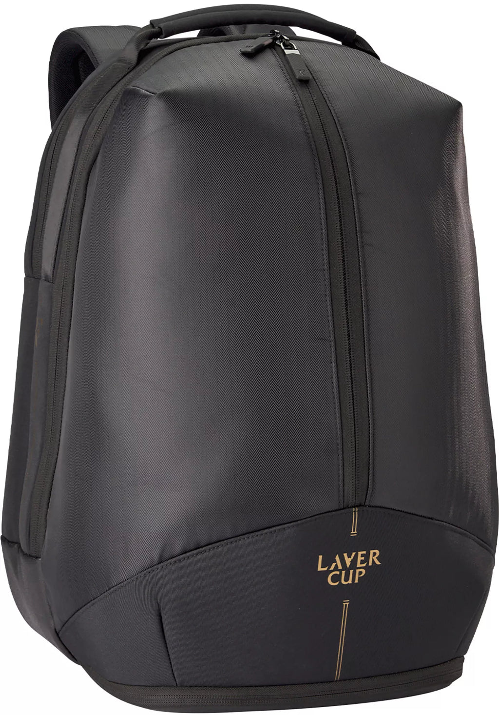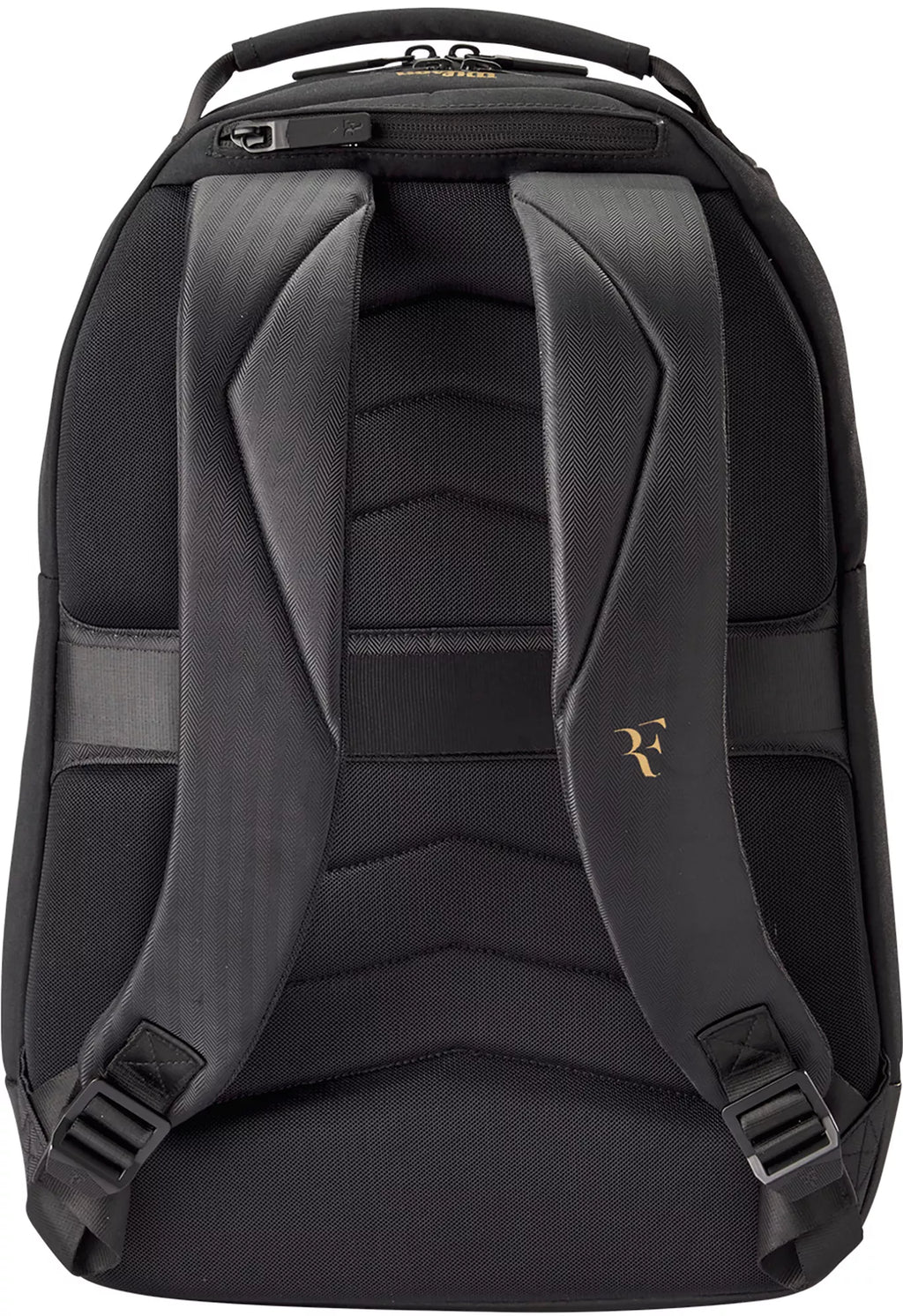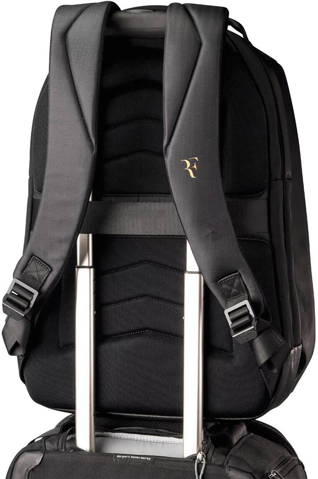 The Wilson RF Backpack Laver Cup brings ease to training and travel days. The design is inspired from the majestic Swiss Alps, a theme that echoes across the Roger Federer collection. This pinstripe bag comes with a soft cushioned back and a strap that attaches to your luggage for smoother transit. It offers enough space for up to two rackets along with a shoe compartment and a fleece-lined accessory pocket for small valuables. An RF logo and RF-detailed zipper-pulls honor the 20-time major champion.